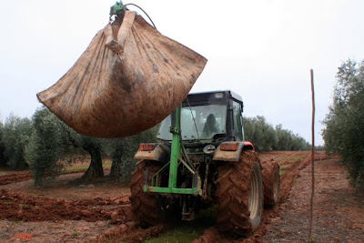 La vareadora mecánica por delante, abre camino; continúan refinando con las varas de siempre, y la sopladora, que amontona la aceituna en varios montones, alrededor de la oliva, esta se coge en los esportones (ahora son de goma, entonces de esparto), y a la pala o a los manteillos, que están en las camada, entre cuatro olivas; el tractor los va llevando al remolque, que se sitúa en una camada, o en el camino mas oreado, para que no se atasque.
